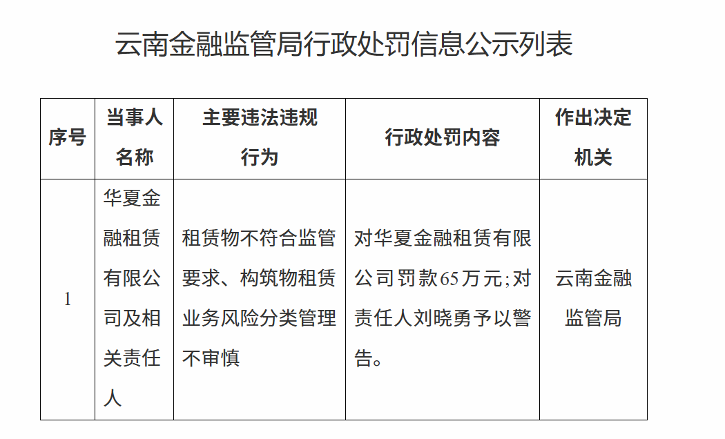 12月4日,云南金融监管局行政处罚信息公示列表显示,华夏金融租赁有限公司及相关责任人因租赁物不符合监管要求、构筑物租赁业务风险分类管理不审慎被罚款65万元;责任人刘某勇被警告。